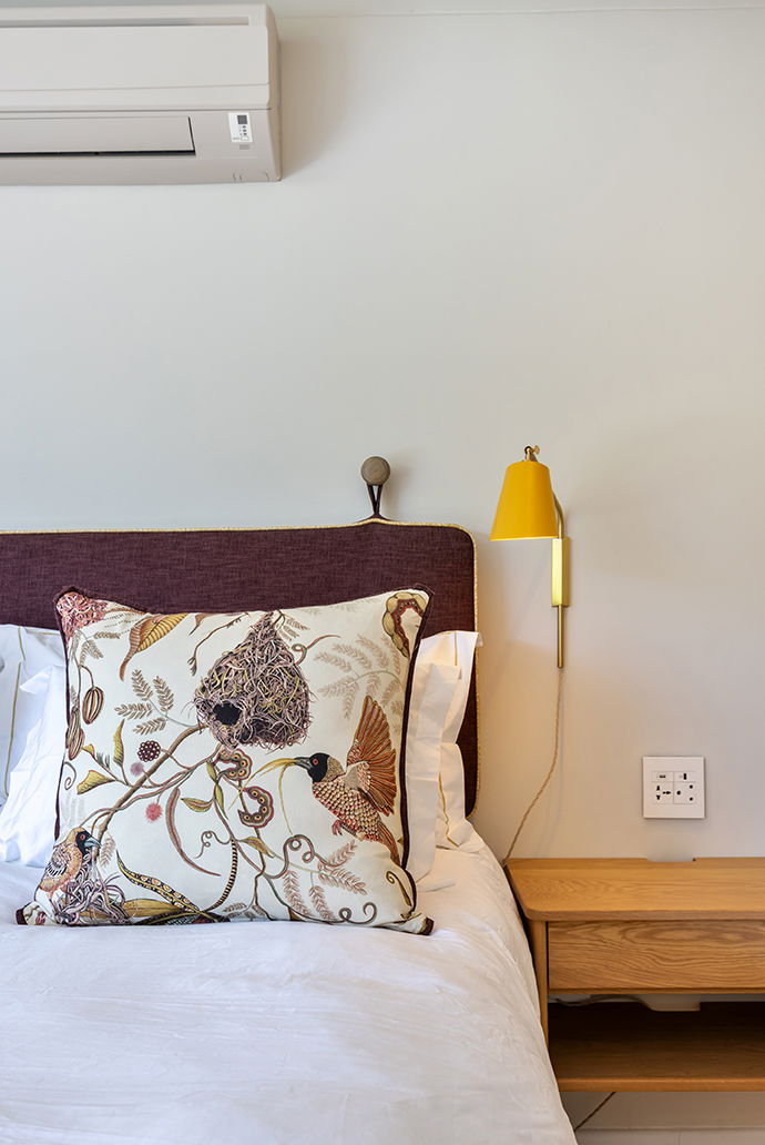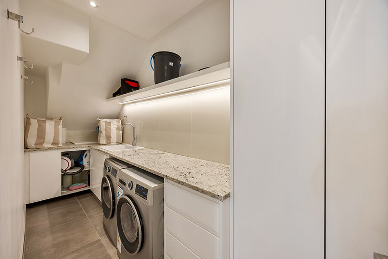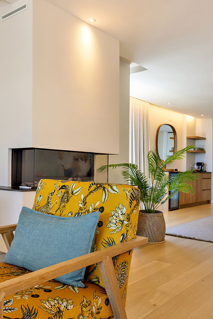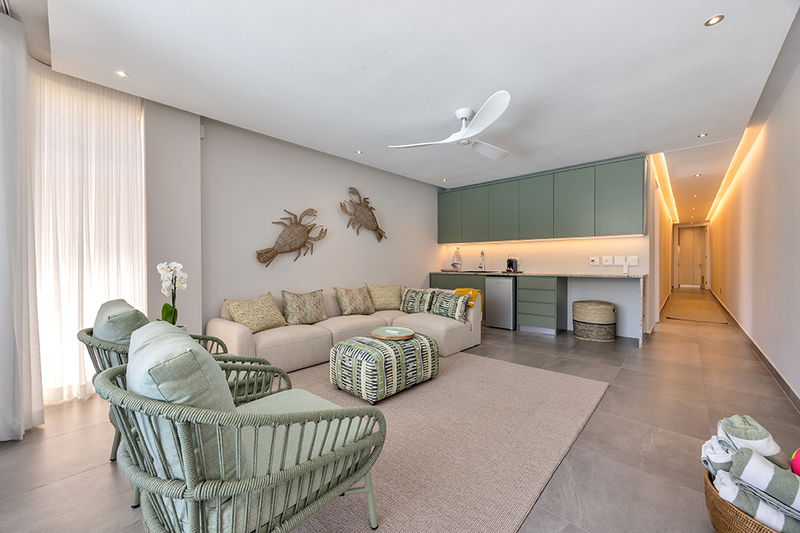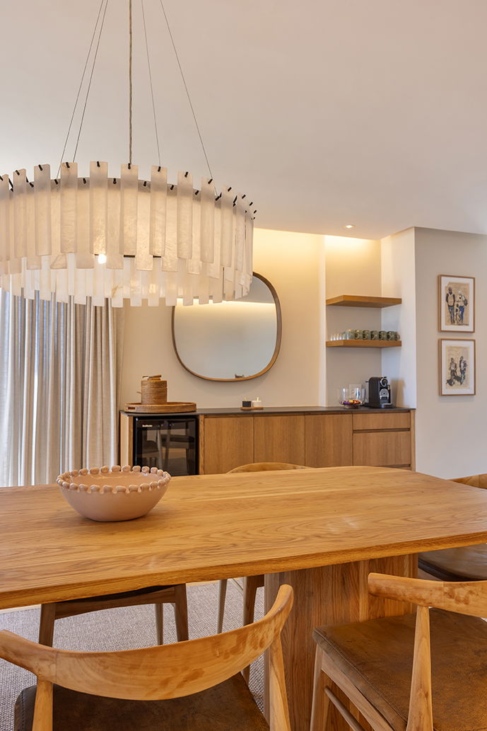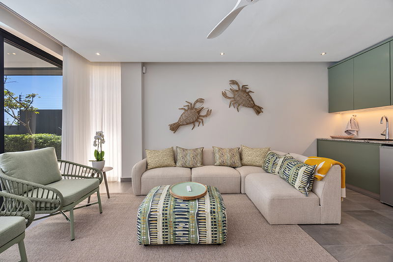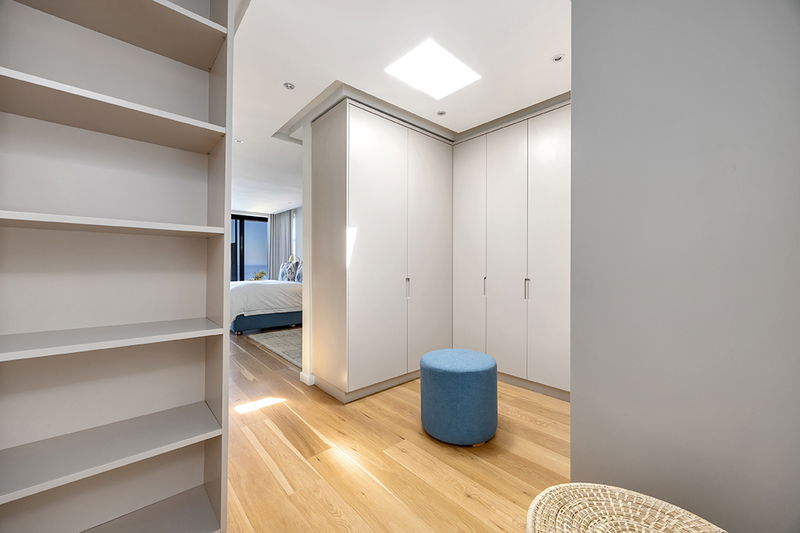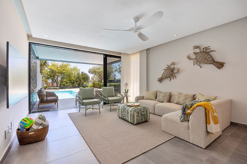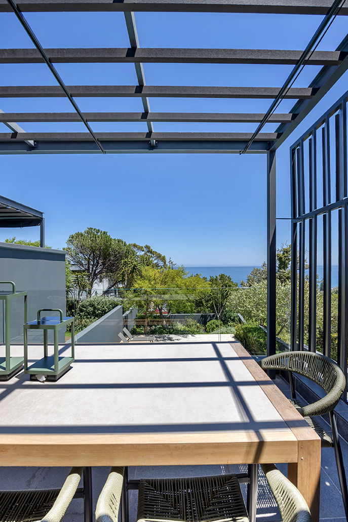 The primary living quarters have been positioned to capitalise on the panoramic scenery. Expansive spaces for cooking, dining and entertaining unfold effortlessly, unified by natural textures such as stone, timber, glass, granite, marble and woven elements. The occasional vibrant fabrics and finishes ground the home firmly within its environment. The greenery of the landscape engulfs the indoor spaces, through the glass doors and windows that welcome the African sunlight, the mountain’s fragrance, and the ocean’s breeze. The fully appointed kitchen forms the heart of this level, complemented by a discreet scullery, and opens onto both the living areas and a generous terrace. An elegant interior dining table seats eight, while the outdoor arrangements offer cosy areas to settle, taking in the magnificent views.