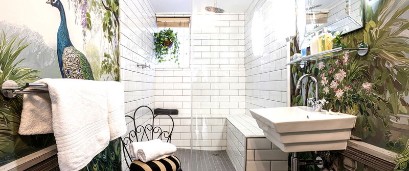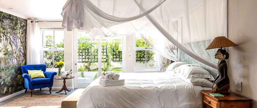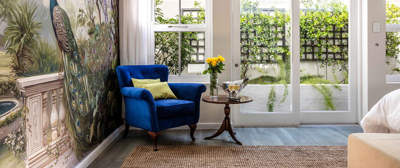 The Peacock Suite offers a romantic and intimate retreat in the heart of Cape Town’s historic Gardens neighbourhood. This beautifully styled one-bedroom suite blends heritage charm with modern comforts, featuring a graceful canopy bed, elegant peacock-and-garden wall accents, and custom wallpapers and chandeliers that pay homage to the city’s rich history. Guests can relax in a private outdoor area or enjoy the luxurious décor, sumptuous linens, air conditioning, WiFi, and daily housekeeping.