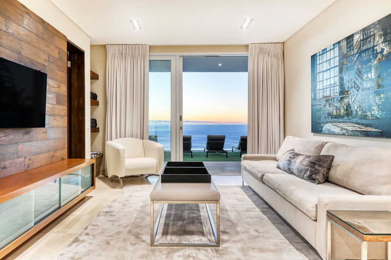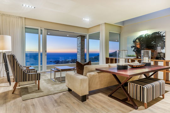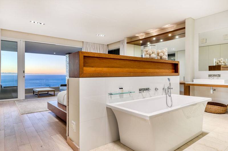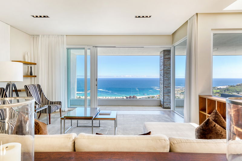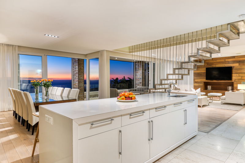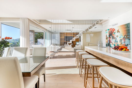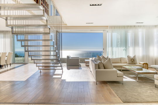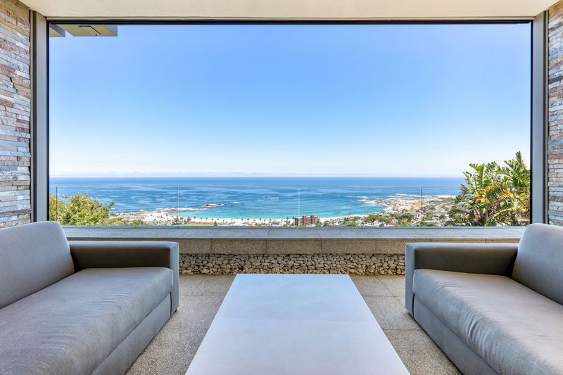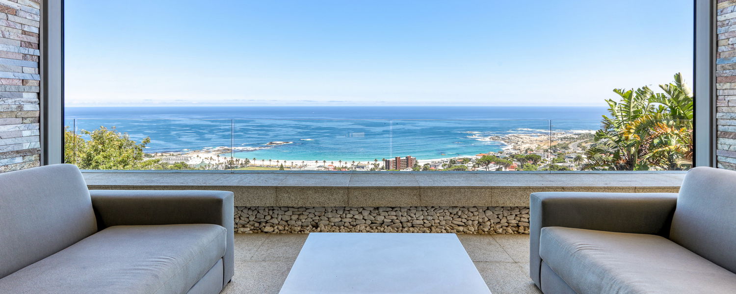 Medburn Villa is an exceptional modern masterpiece comprising 3 light filled levels, perfectly positioned on the slopes above Camps Bay. Each level has a terrace complete with beautiful outdoor furniture from which to enjoy spectacular ocean views from sunset to sundown. Medburn’s incredible vistas can be enjoyed from every room in the house no matter where one chooses to relax.