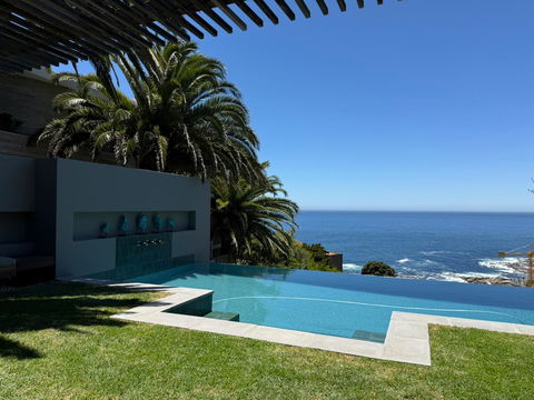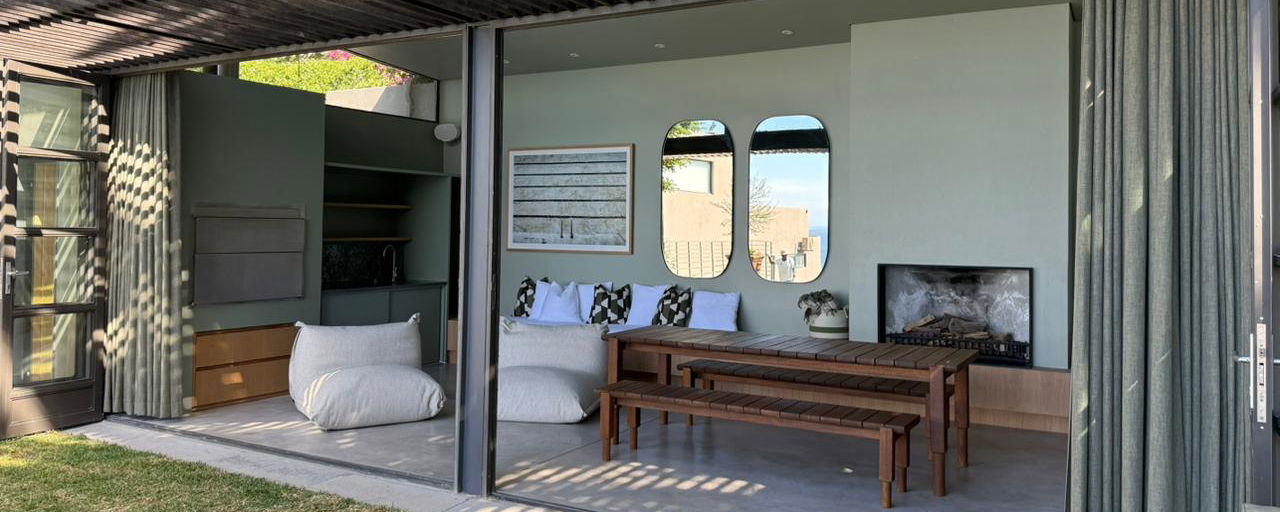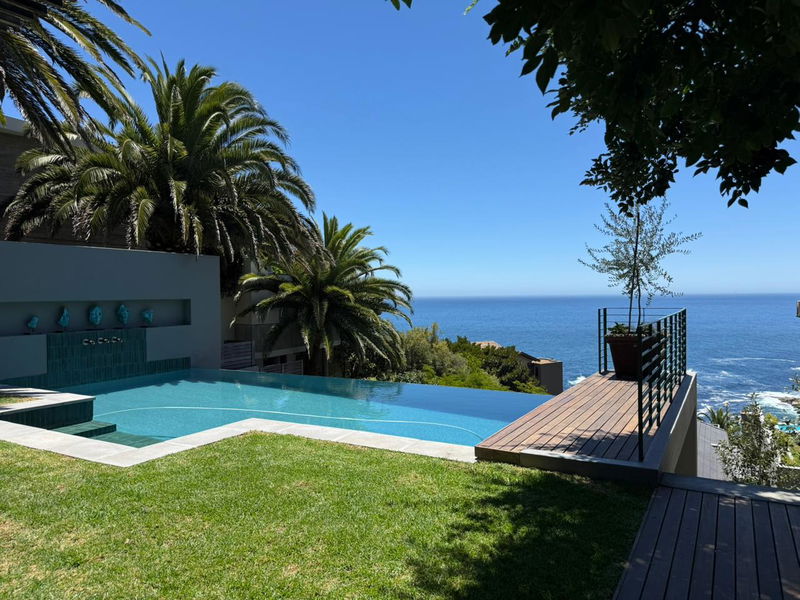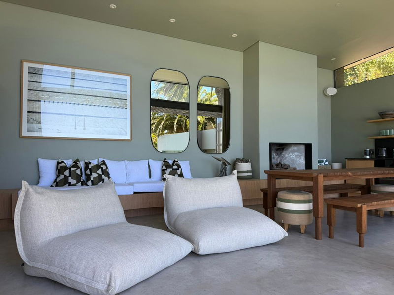 The grand entrance escorts you down a corridor that immediately reveals a tropical tale through its bespoke wallpaper. Where the Cape mountain leopard and different endangered species can be spotted among the foliage. Through to an open-plan, living, dining, cooking and entertaining area. One of the large ensuite bedrooms boasts a Flexform occasional chair adding sophisticated comfort when opening up to a long verandah overlooking the ocean. The ideal spot for al-fresco evenings, gathered around the dining table. Down the glass corridor to the other ensuite bedrooms, where the sentiment of elegance accompanies you at every turn.The dining area is anchored by the modern glamour of Jonathan Adler and Bo concepts chairs and a minimalist Poliform dining table,
