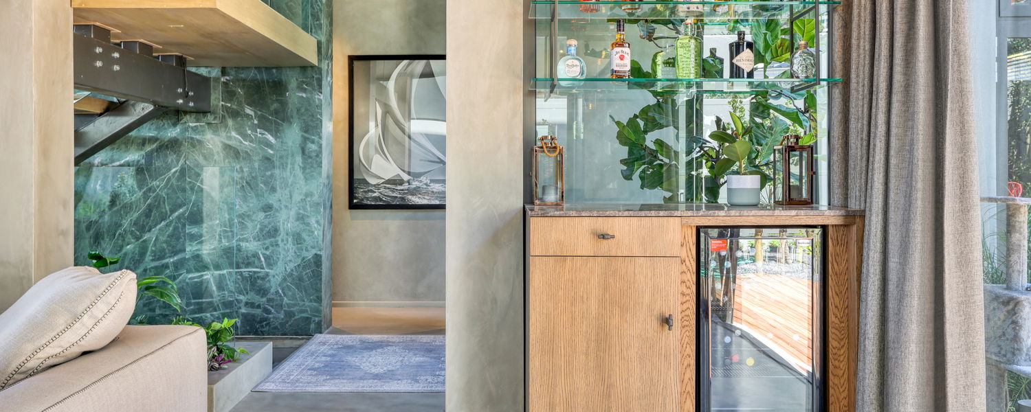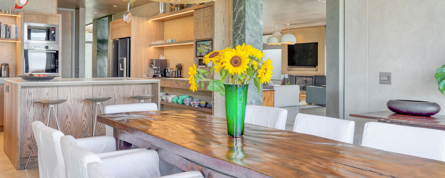 Inside, open-plan living areas flow easily from lounge to dining to garden, with natural light accentuating the villa’s layered palette of glass, greenery, and wood. The interiors are curated rather than styled — artful, tactile, and thoughtful at every turn.